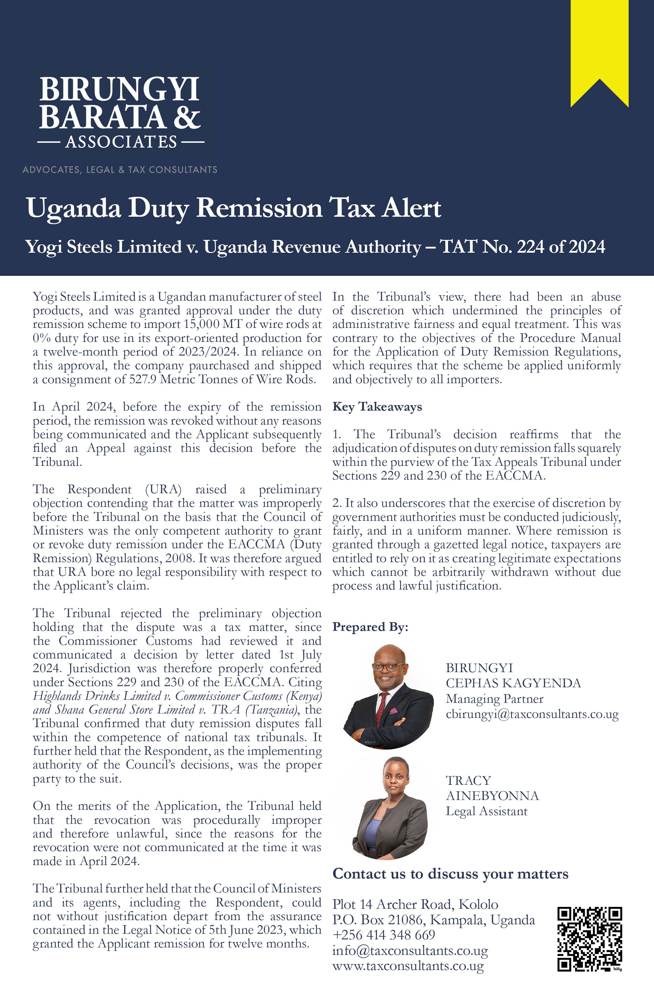 Yogi Steels Limited is a Ugandan manufacturer of steel products, and was granted approval under the duty remission scheme to import 15,000 MT of wire rods at 0% duty for use in its export-oriented production for a twelve-month period of 2023/2024. In reliance on this approval, the company paurchased and shipped a consignment of 527.9 Metric Tonnes of Wire Rods.
